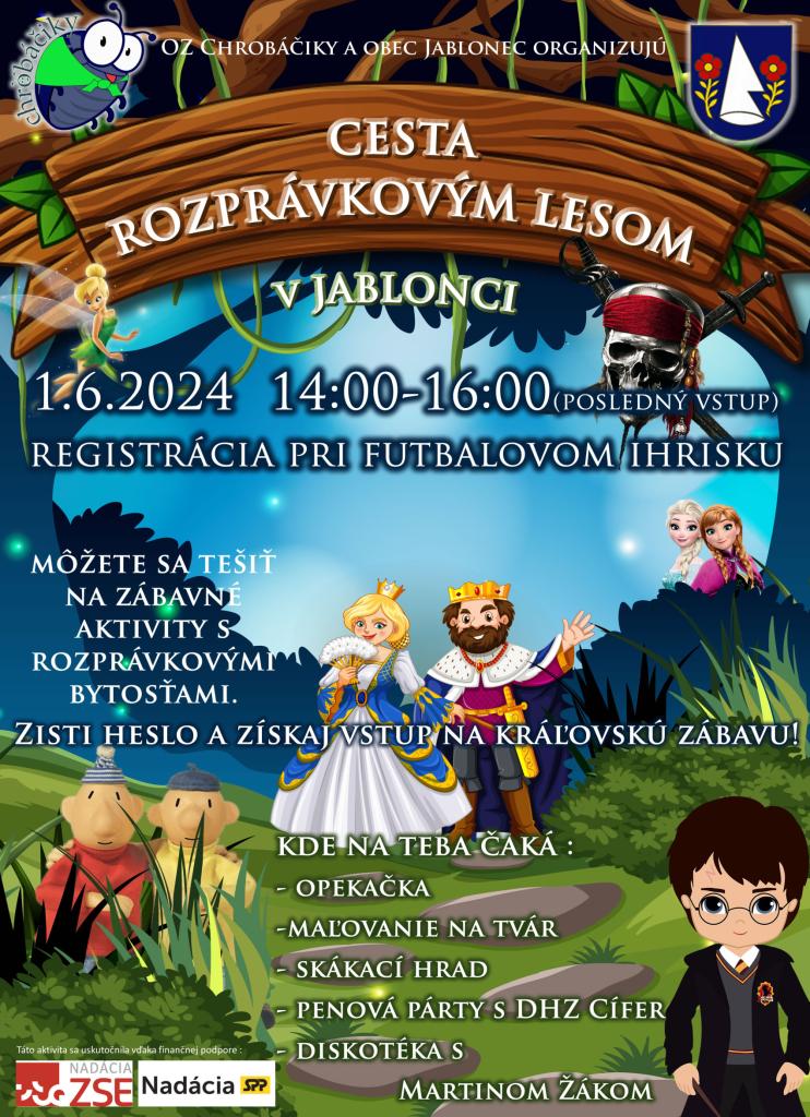 Pozývame všetky detičky a ich rodičov na CESTU ROZPRÁVKOVÝM LESOM v Jablonci. Podujatie sa uskutoční v sobotu 1. júna 2024 od 14:00 hodiny. Tešíme sa na Vás !