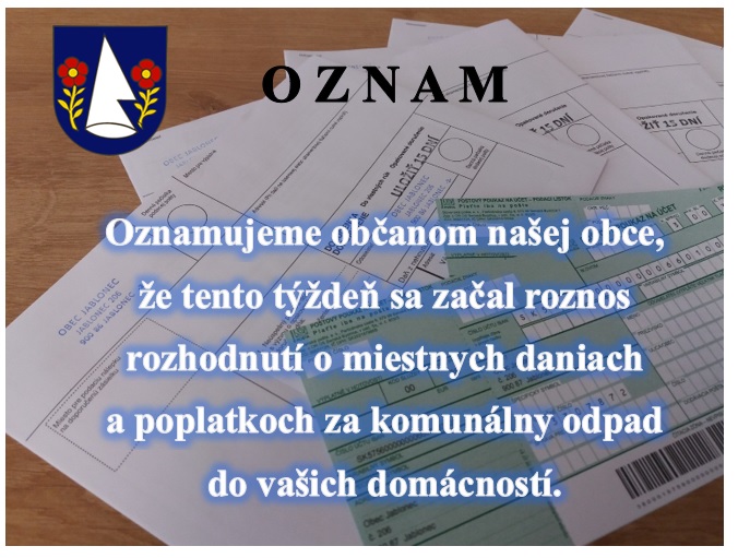 Oznamujeme občanom našej obce, že tento týždeň sa začal roznos rozhodnutí o miestnych daniach a poplatkoch za komunálny odpad do vašich domácností.
