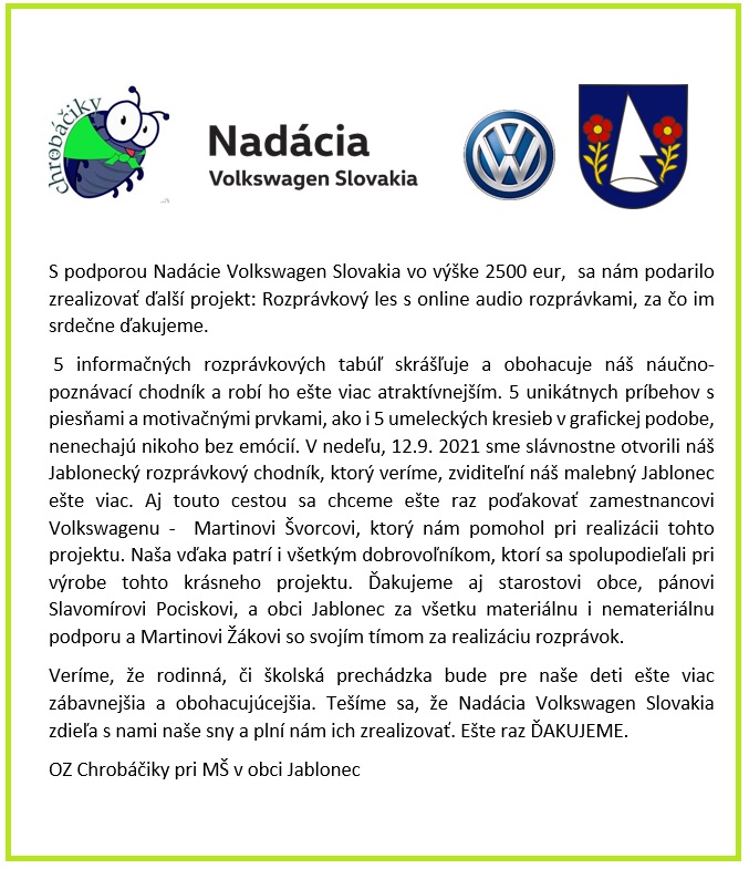 5 informačných rozprávkových tabúľ skrášľuje a obohacuje náš náučno-poznávací chodník a robí ho ešte viac atraktívnejším. 5 unikátnych príbehov s piesňami a motivačnými prvkami, ako i 5 umeleckých kresieb v grafickej podobe, nenechajú nikoho bez emócií. V nedeľu, 12.9. 2021 sme slávnostne otvorili náš Jablonecký rozprávkový chodník, ktorý veríme, zviditeľní náš malebný Jablonec ešte viac. Aj touto cestou sa chceme ešte raz poďakovať zamestnancovi Volkswagenu - Martinovi Švorcovi, ktorý nám pomohol pri realizácii tohto projektu. Naša vďaka patrí i všetkým dobrovoľníkom, ktorí sa spolupodieľali pri výrobe tohto krásneho projektu. Ďakujeme aj starostovi obce, pánovi Slavomírovi Pociskovi, a obci Jablonec za všetku materiálnu i nemateriálnu podporu a Martinovi Žákovi so svojím tímom za realizáciu rozprávok.