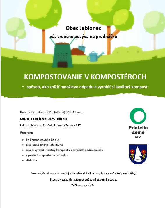 Srdečne Vás pozývame na prednášku skúseného lektora KOMPOSTOVANIE V KOMPOSTÉROCH dňa 15. októbra 2019 o 16:30 hodine v Spoločenskom dome. Obsahom prednášky bude čo kompostovať, ako kompostovať, ako si vyrobiť kvalitný kompost, využitie kompostu a diskusia.