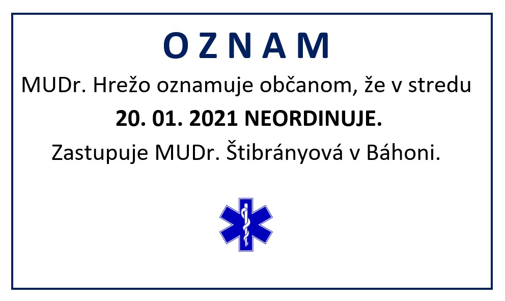 MUDr. Hrežo v stredu 20.01.2021 neordinuje. Zastupuje MUDr. Štibrányová v Báhoni.