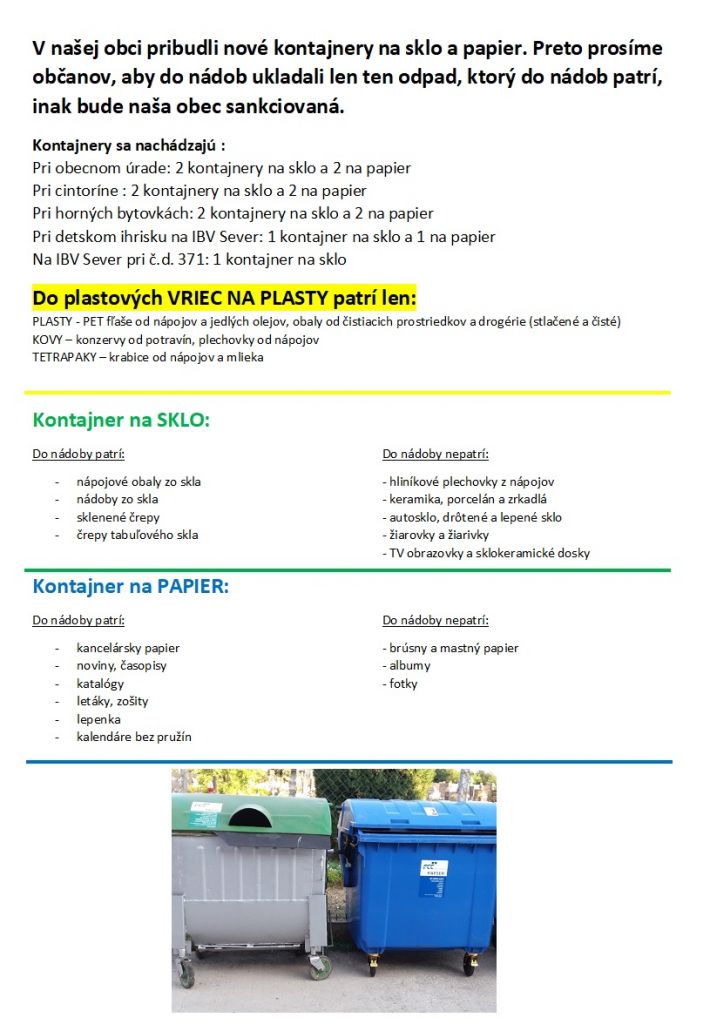 V našej obci pribudli nové kontajnery na sklo a papier. Preto prosíme občanov, aby do nádob ukladali len ten odpad, ktorý do nádob patrí, inak bude naša obec sankciovaná.