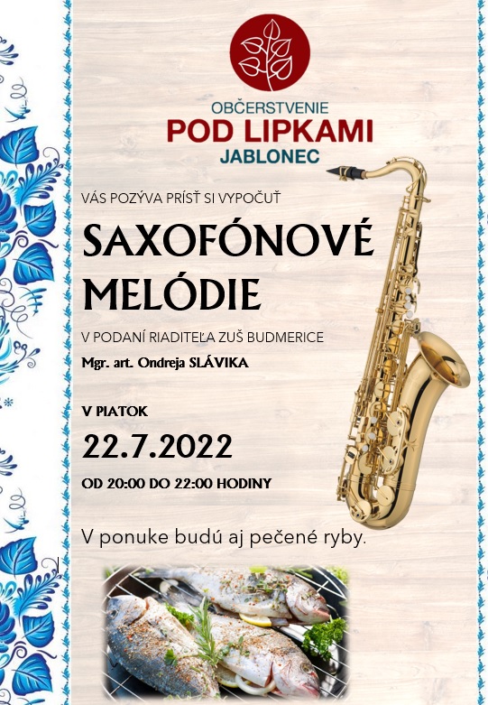 OBČERSTVENIE POD LIPKAMI Vás pozýva prísť si vypočuť saxofónové melódie v podaní riaditeľa ZUŠ Budmerice Mgr. art. Ondreja Slávika v piatok 22.júla 2022 od 20:00 hodiny.