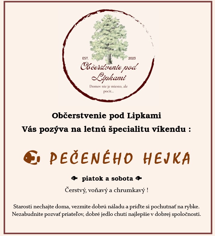Občerstvenie pod Lipkami Vás pozýva počas víkendu - piatok a sobota na pečeného hejka.