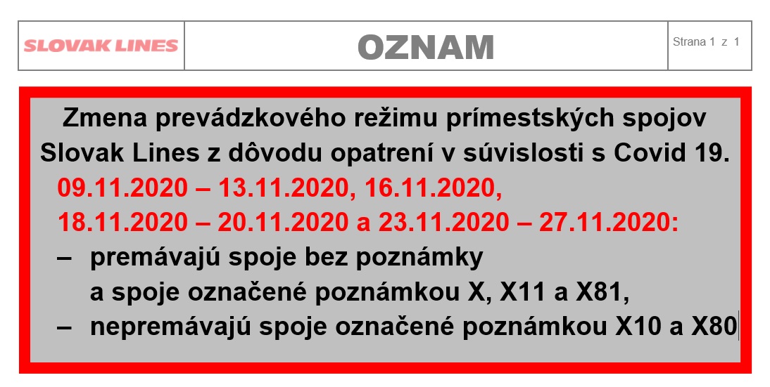 Zmena prevádzkového režimu prímestských spojov Slovak Lines z dôvodu opatrení v súvislosti s Covid 19.