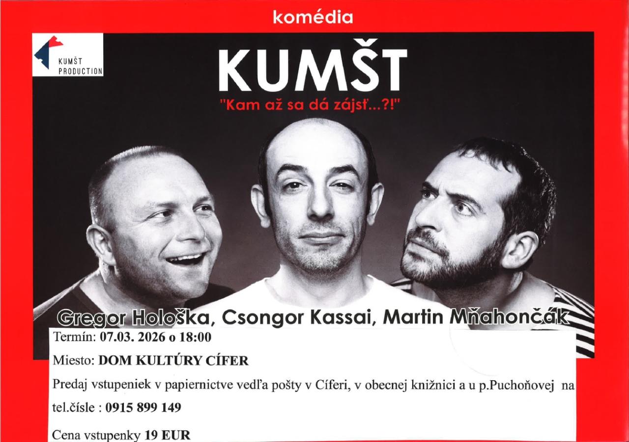 srdečne vás pozývame na divadelné predstavenie KUMŠT, ktoré si budete môcť vychutnať v Cíferi. Príďte zažiť večer plný humoru, emócií a skvelých hereckých výkonov.