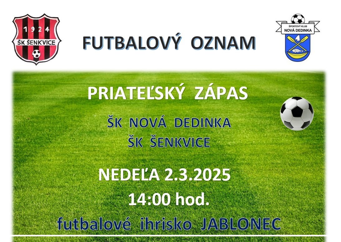 Pozývame priaznivcov futbalu na priateľský zápas ŠK Nová Dedinka a a ŠK Šenkvice, ktorý sa bude konať v nedeľu 2. marca 2025 o 14:00 hodine na futbalovom ihrisku v Jablonci.