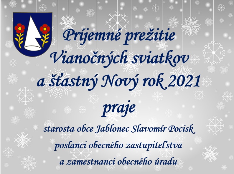 Príjemné prežitie Vianočných sviatkov a šťastný Nový rok 2021 praje starosta obce Jablonec Slavomír Pocisk, poslanci obecného zastupiteľstva a zamestnanci obecného úradu.