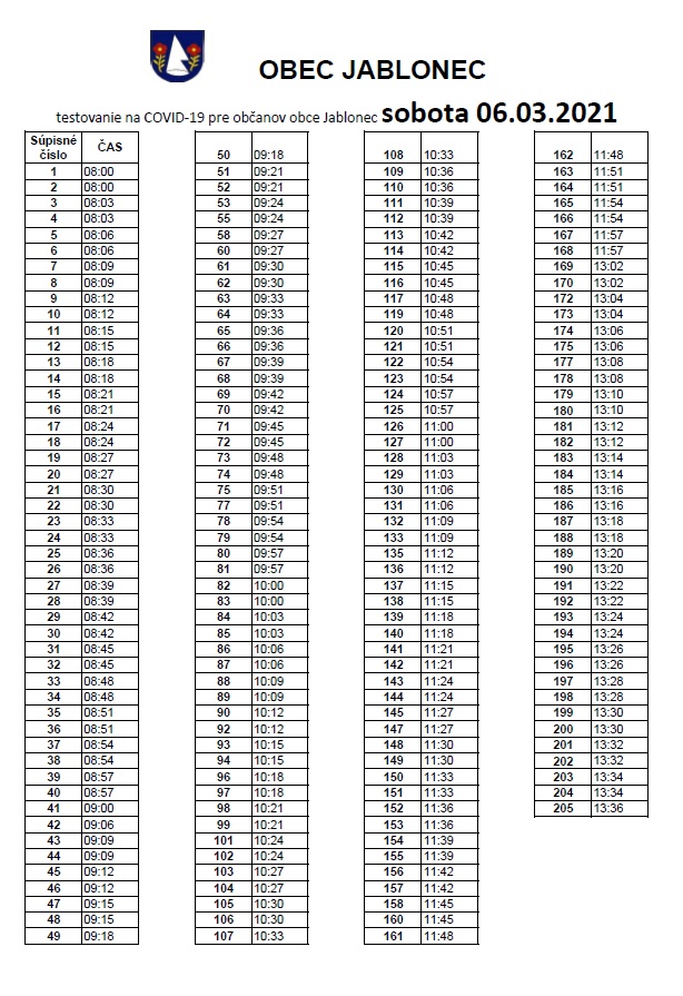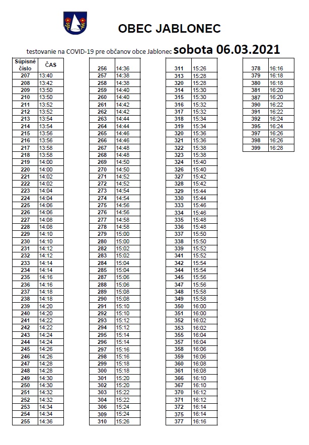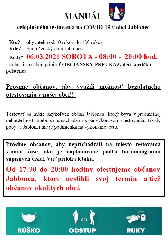 V sobotu 6.marca 2021 sa uskutoční v Spoločenskom dome testovanie na COVID-19 v čase od 08:00 do 20:00 hodiny.
