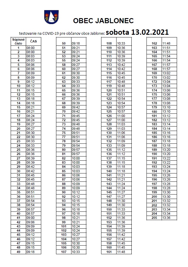 V sobotu 13. februára 2021 sa v našej obci bude konať testovanie na COVID-19 od 08:00 do 20:00 hodiny.