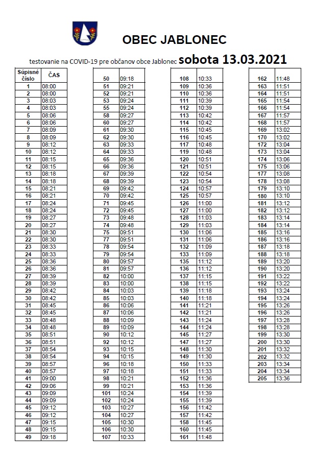 V sobotu 13. marca 2021 v čase od 08:00 do 19:45 hod. sa bude v Spoločenskom dome testovať na COVID-19.