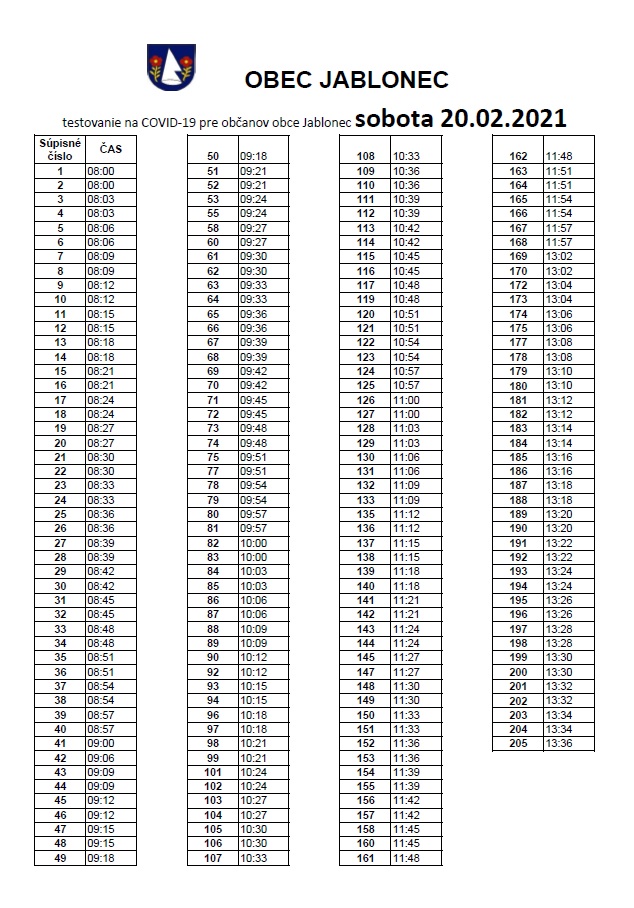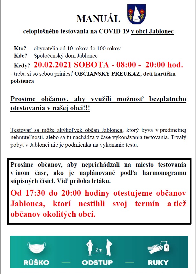 V sobotu 20.02.2021 sa bude v Spoločenskom dome testovať na COVID-19 v čase od 08:00 do 20:00 hodiny.