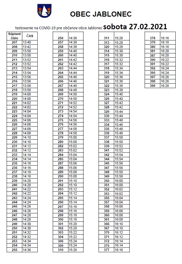 V sobotu 27.02.2021 sa bude konať testovanie na COVID-19 v Spoločenskom dome v Jablonci v čase od 08:00 do 20:00 hodiny.