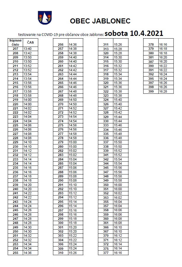 V sobotu 10. apríla 2021 v čase od 8:00 do 18:45 hod. sa bude testovať na ochorenie COVID-19 v Spoločenskom dome.