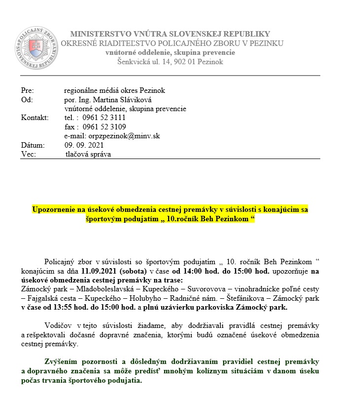 Upozornenie na úsekové obmedzenia cestnej premávky - Pezinok - tlačová správa