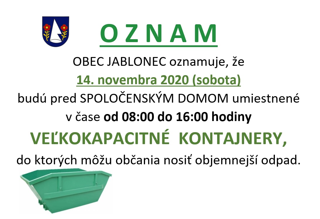 OBEC JABLONEC oznamuje, že 14. novembra 2020 (sobota) budú pred SPOLOČENSKÝM DOMOM umiestnené v čase od 08:00 do 16:00 hodiny VEĽKOKAPACITNÉ KONTAJNERY, do ktorých môžu občania nosiť objemnejší odpad.