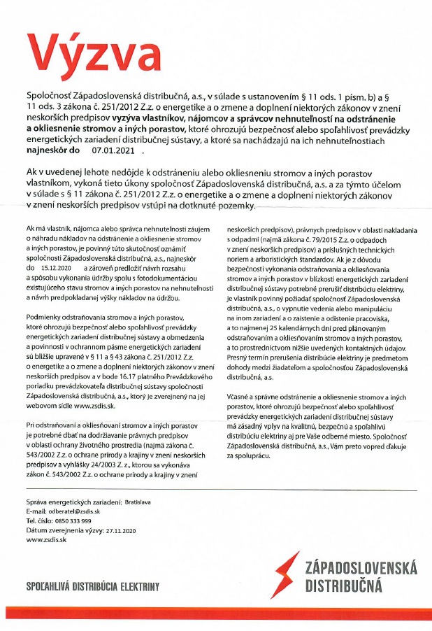 Spoločnosť Západoslovenská distribučná, a.s., v súlade s ustanovením §11 ods. 1 písm. b) a § 11 ods. 3 zákona č. 251/2012 Z.z. o energetike a o zmene a doplnení niektorých zákonov v znení neskorších predpisov vyzýva vlastníkov, nájomcov a správcov nehnuteľností na odstránenie a okliesnenie stromov a iných porastov, ktoré ohrozujú bezpečnosť alebo spoľahlivosť prevádzky energetických zariadení distribučnej sústavy, a ktoré sa nachádzajú na ich nehnuteľnostiach najneskôr do 07.01.2021.