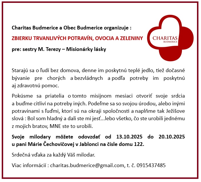 Zbierka trvanlivých potravín, ovocia a zeleniny - Charitas Budmerice a Obec Budmerice